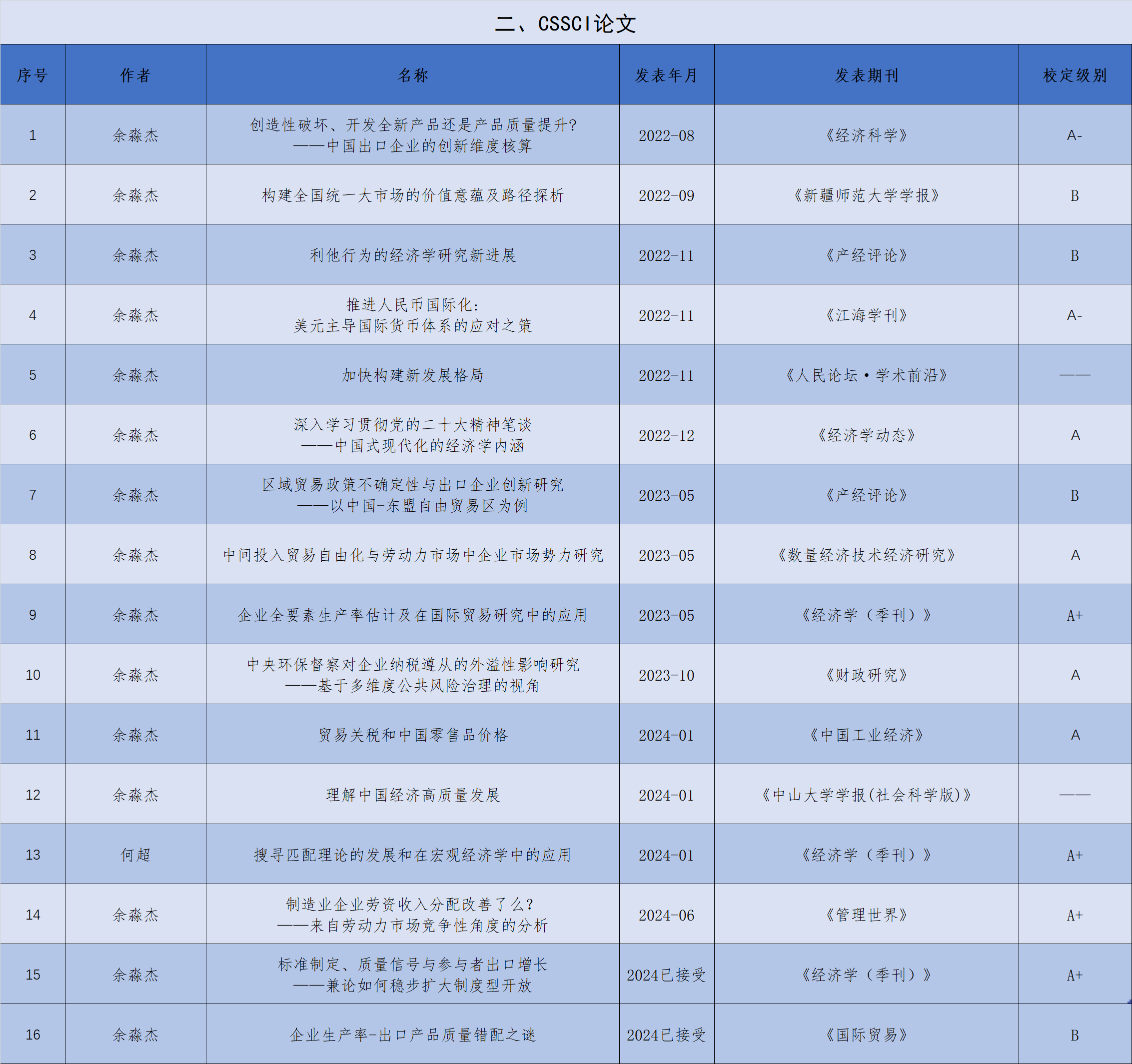 研究院成立伊始便对标世界一流学术前沿,鼓励教师用国际学术语言讲述中国故事,创新理论体系。教师们有着扎实的前期积累,经过入职以来的酝酿沉淀,相继在各自研究领域的国际顶级期刊上发表文章。据统计,截至目前,经济学部教师近两年在经济学7本国际顶级期刊Review of Economics and Statistics,Journal of Development Economics, Journal of Public Economics, Journal of Economics & Management Strategy, Journal of Labor Economics, Journal of Economic Theory, Journal of Human Resources上共发表文章8篇,其中7篇来自中国经济研究院引进的中青年人才。此外,他们还在《管理世界》《经济学(季刊)》等顶级中文期刊发表论文4篇,《中国工业经济》《数量经济技术经济研究》等一流中文期刊发表论文4篇。研究院教师为学校“双一流”建设贡献了一个又一个标志性成果!